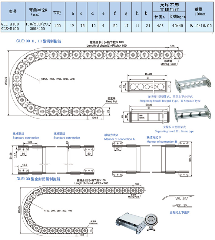 TLG100F全封閉式鋼制拖鏈,節(jié)距100mm,彎曲半徑可分150/200/250/300,最小寬度60mm,內(nèi)徑高度50mm。