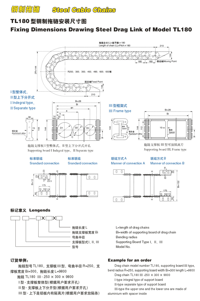 TL180III型鋼制拖鏈:簡介:節(jié)距180mm,彎曲半徑有250,300,350,400,450,500,600,.鏈板高度144mm,拖鏈內(nèi)徑高度112mm.